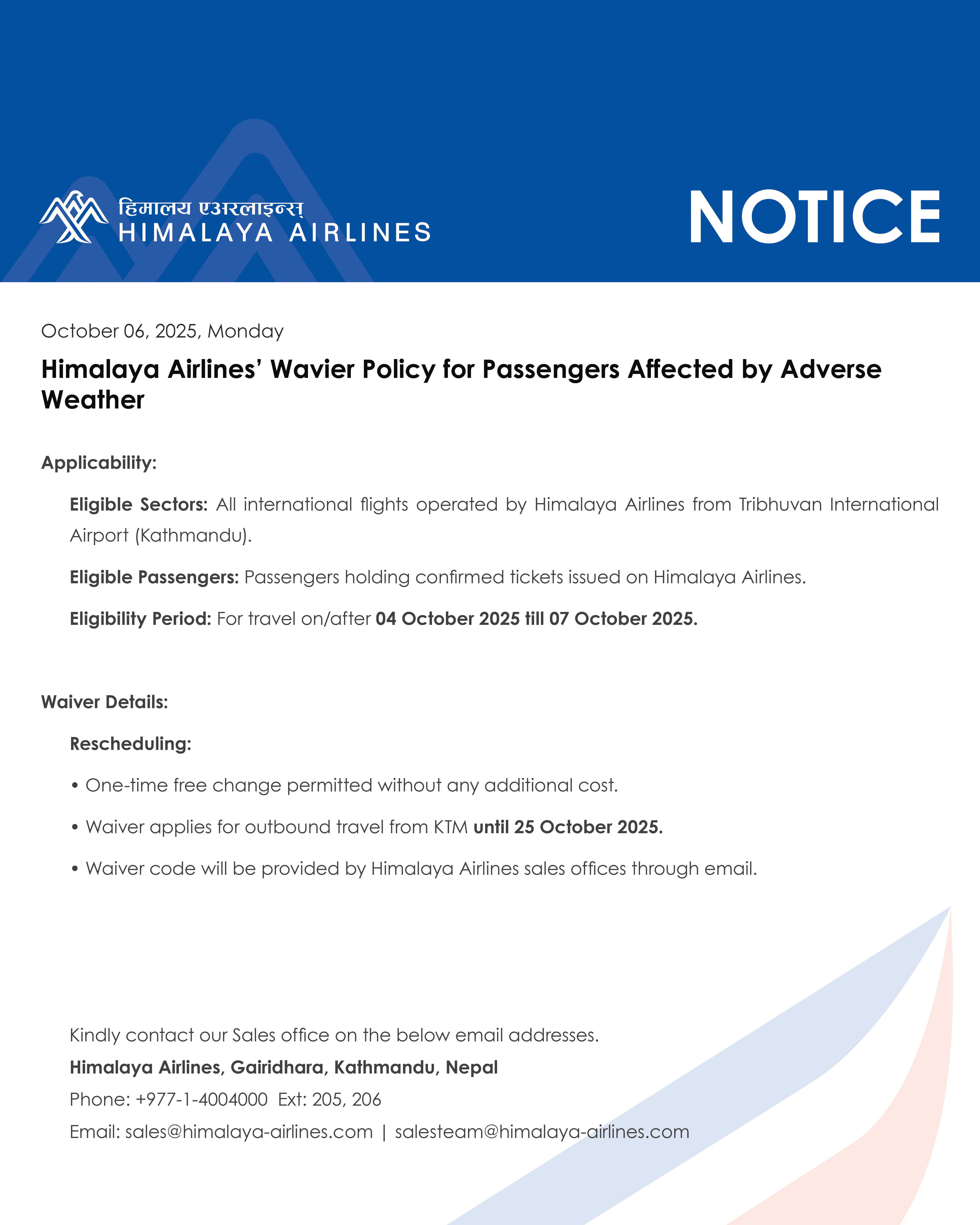 Himalaya Airlines' Wavier Policy for Passengers Affected by Adverse Weather