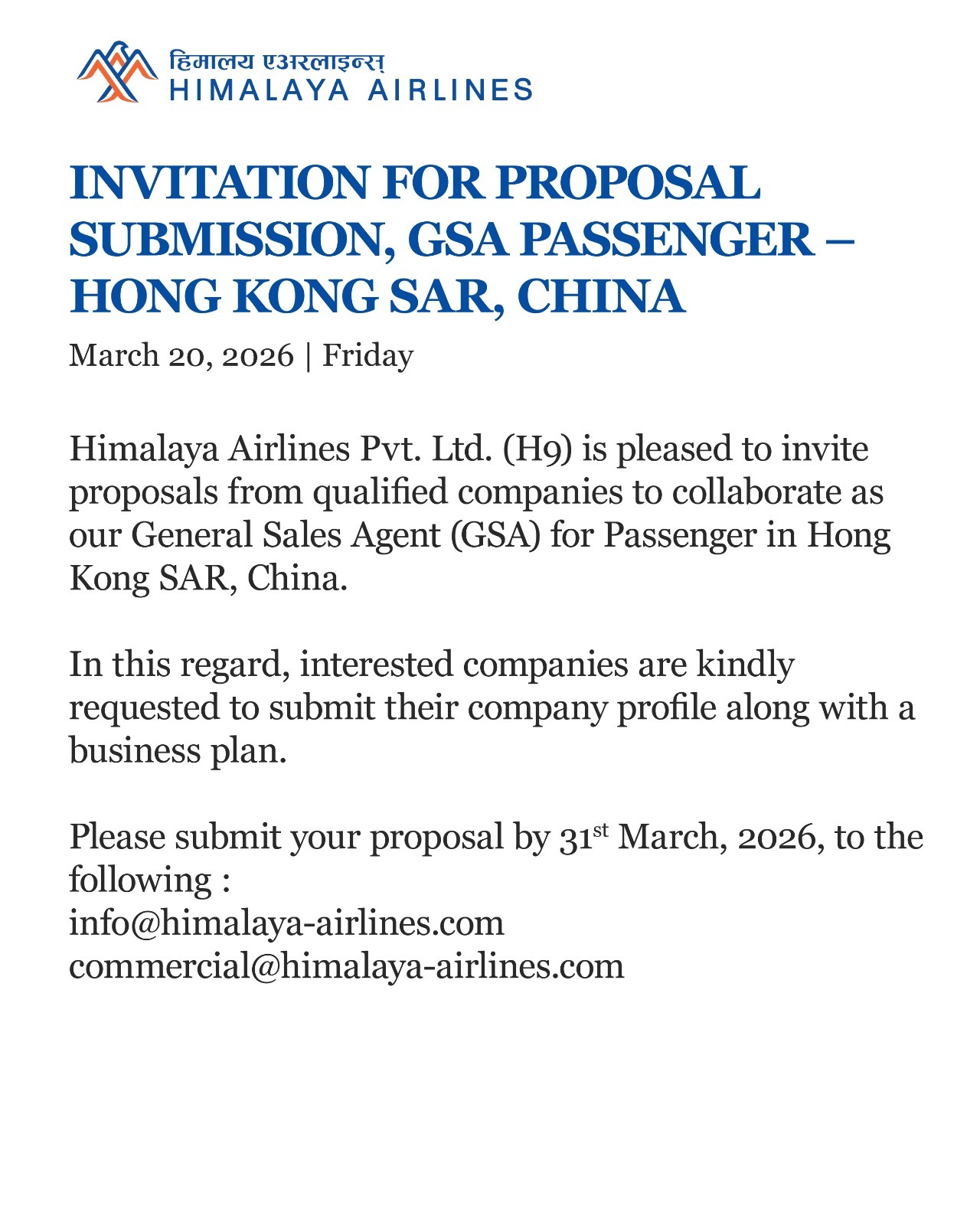 INVITATION FOR PROPOSAL SUBMISSION, GSA PASSENGER – HONG KONG SAR, CHINA