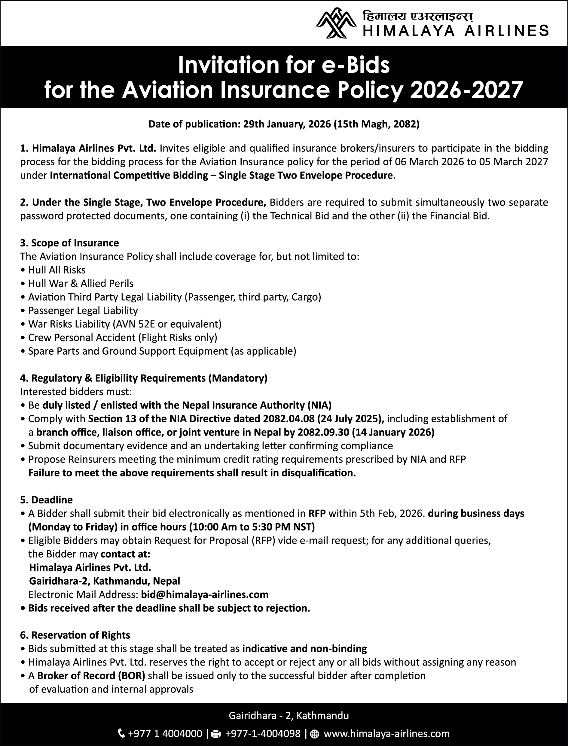 Invitation for e-Bid for the Aviation Insurance Policy 2026 - 2027