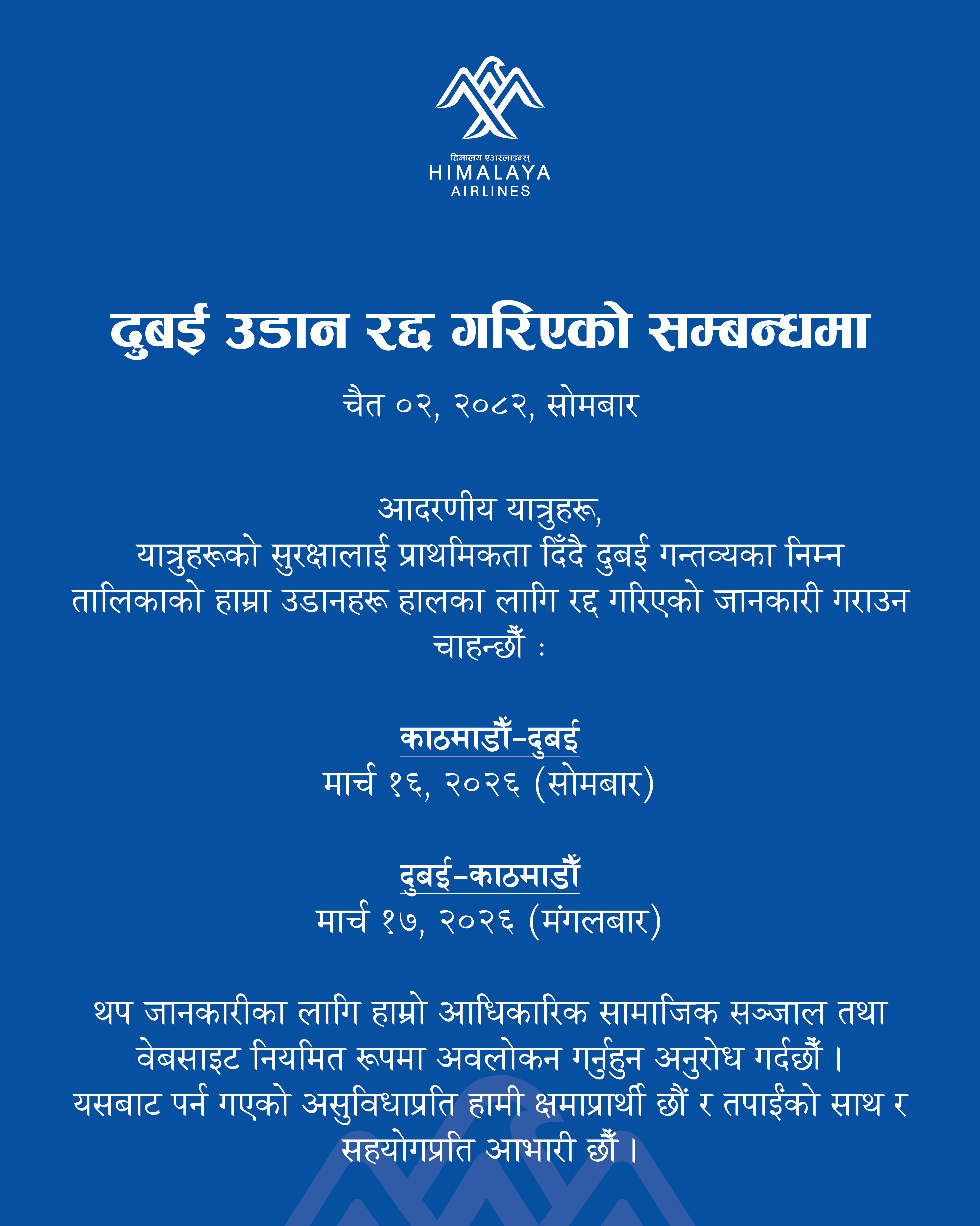 दुबई उडान रद्द गरिएको सम्बन्धमा