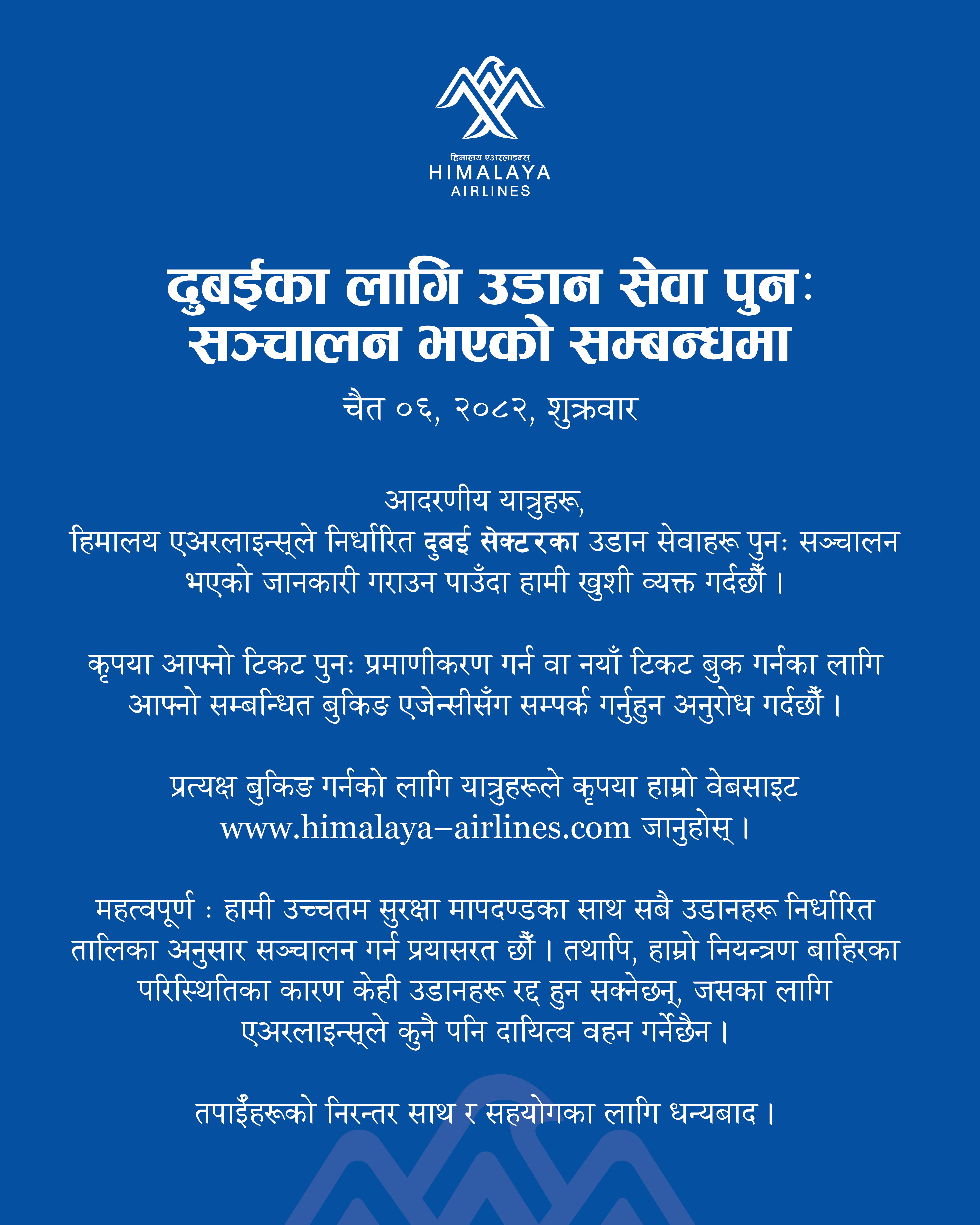 दुबईका लागि उडान सेवा पुनः सञ्चालन भएको सम्बन्धमा